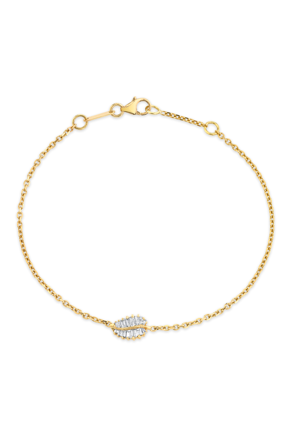 Small Palm Leaf Chain Bracelet in 18k yellow gold, length 6.5 in, Baguette cut diamonds total 0.2 ct. FG VS...