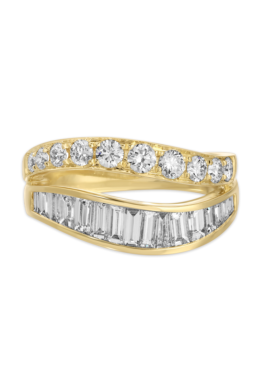 Two-row Wave Ring in 18k yellow gold, size US 6, Baguette cut diamonds total 1.07 ct. FG VS, Round cut diamonds total... 0.55 ct. FG VS