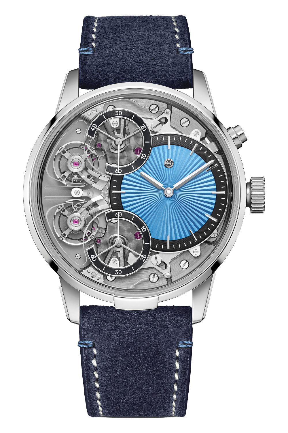 Ice Blue features a sunray guilloché pattern. The lines radiating from the dial’s center are decorated using a traditional hand-operated rose engine lathe. The ice blue dial playfully catches and reflects light, creating an even more vibrant and deep view under the sapphire crystal. The new indexes and hands are beveled and polished, adding even more movement to the compelling design. On the left side of the dial, the resonance mechanism takes centre stage: two balances oscillating in opposite directions, connected by Armin Strom’s patented clutch. Two second counters confirm the synchronization of the balances. The anthracite-coloured bridges, surrounded by a 43 mm stainless steel case, remains discreetly in the background as if admiring the composition of the elements. A dark blue Alcantara strap gives the watch a refined look.
