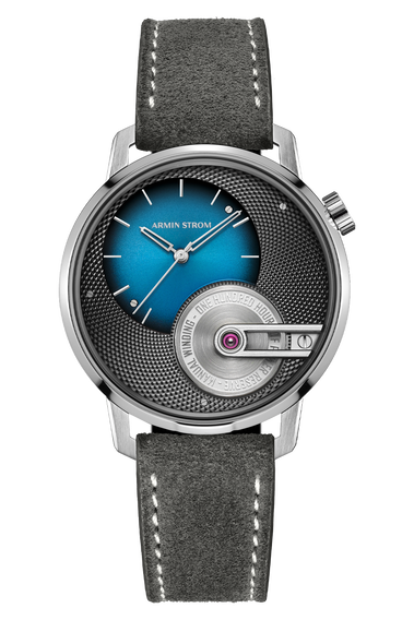 Dramatic, intense and reflecting a multitude of tones, the fumé dial gives a new depth to the already... three-dimensional Tribute 1. Armin Strom’s unique take on the most fundamental of timekeepers, the Tribute 1 features an offset dial and a bridge holding the innovative “motor barrel”, which offers 100 hours of power reserve. The guilloché engraved dial plate is handcrafted by celebrated independent watchmaker Kari Voutilainen’s dial atelier. The Tribute 1 Fumé is limited to 10 pieces each in Ocean, Slate, Sky and Burgundy fumé dial colours.