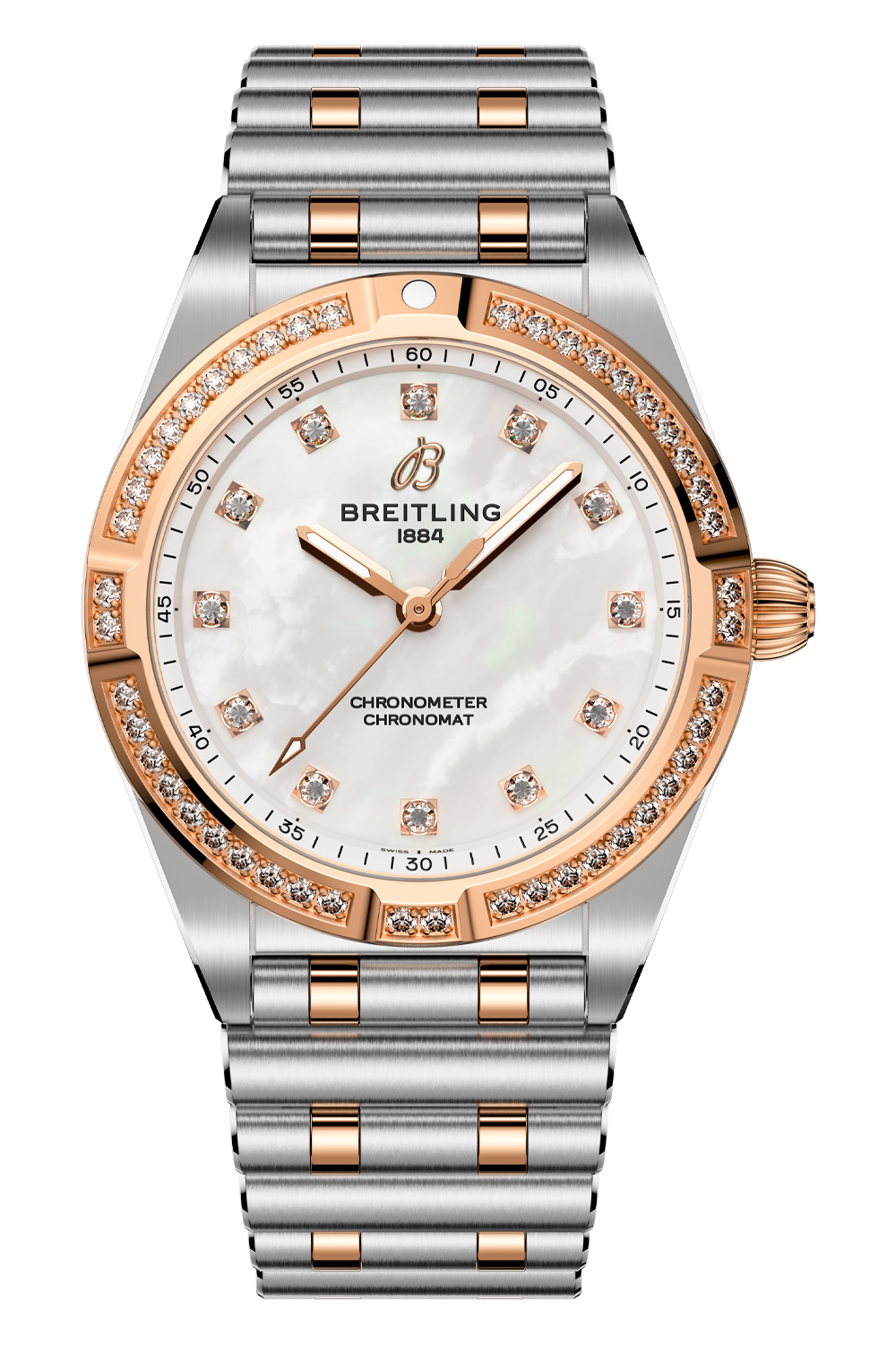 On trend, yet timeless, the petite Chronomat 28 is the versatile sports chic watch for any occasion. These... showstoppers have so much more to offer than just their trim new sizes. Mother-of-pearl in various shades and traceable lab-grown diamonds combine with subtle refinements to give the timepieces a jewelry-like appeal. Choose your case and Rouleaux bracelet style: from straight-up stainless steel to mixed-metal duotone—all with a comfortable butterfly folding clasp. The Chronomat 28 is powered by the Breitling Caliber 72, a COSC-certified SuperQuartz™ chronometer.