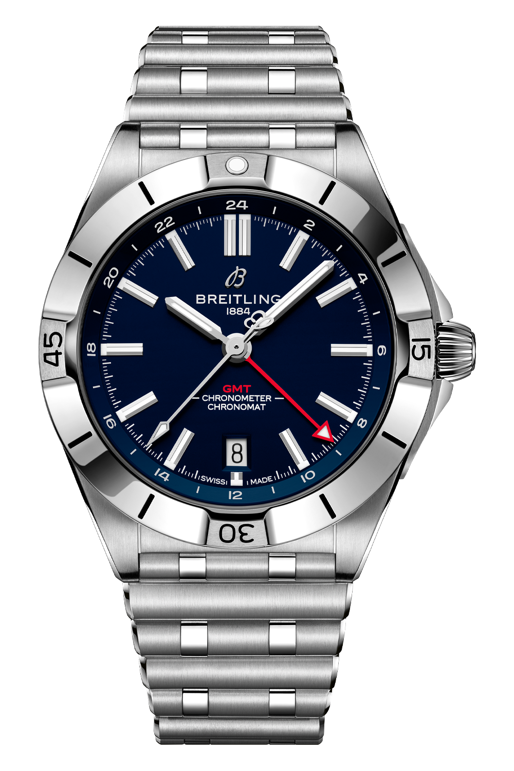 A match-up as exciting as Super Bowl. Breitling, the Official Timepiece Partner of the NFL, celebrates all 32 teams... with the Chronomat Automatic GMT 40 NFL Team Editions. Each watch features team colors on the dial, a date window at 6 o’clock, and a GMT hand in a contrasting shade unique to every model. The second time zone keeps you ready for kickoff, whether you’re at home or away. With its signature steel Rouleaux bracelet and a caseback engraved with your team’s logo, this Chronomat makes a confident statement. Whether you’re representing on game day or every day, this is your ultimate fan gear—engineered with Breitling precision and built to go the distance.