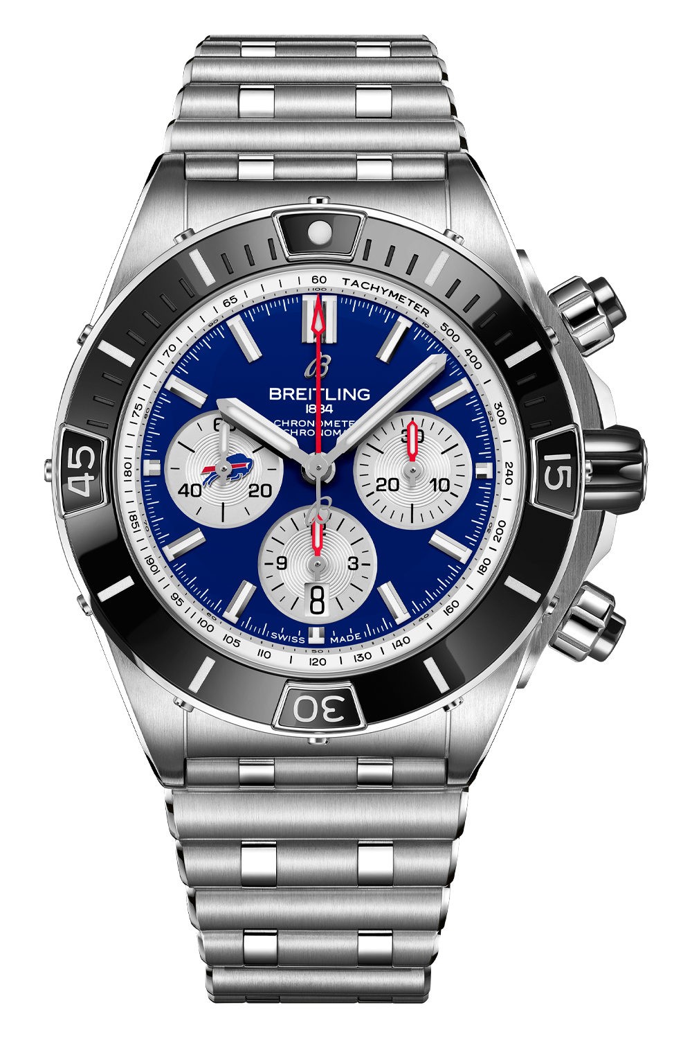 The Super Chronomat B01 44 Buffalo Bills Edition celebrates the power of Buffalo’s team with its royal blue dial and... white subdials with the recognizable Buffalo Bills logo in the 9 o’clock subdial. Available in 18k red gold with a Rouleaux-style rubber strap or in stainless steel with a Rouleaux bracelet. The Super Chronomat comes in an upsized 44mm case and features a ceramic bezel insert, screw-down pushers, and crown, making it our supercharged Chronomat. This is the ultimate timepiece to show your support for Buffalo’s home team.