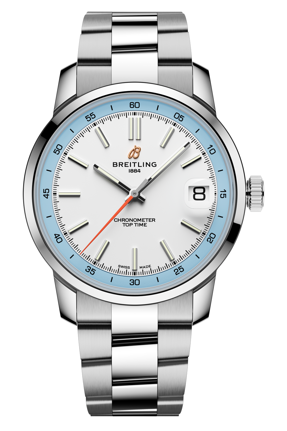 The Top Time B31 blends retro aesthetics with a modern edge. Its dial design takes inspiration from classic-car... dashboard clocks, while its 38 mm case strikes a balance between vintage proportions and contemporary design, perfect for any wrist thanks to its universal size. Three colorways—green, blue, or a two-tone combination of white and sky-blue—pair with either a three-row stainless-steel bracelet or a perforated calfskin strap that gives a nod to vintage racing gloves. Whether cruising the open road or simply embracing the everyday, this watch is a celebration of individuality and adventure.