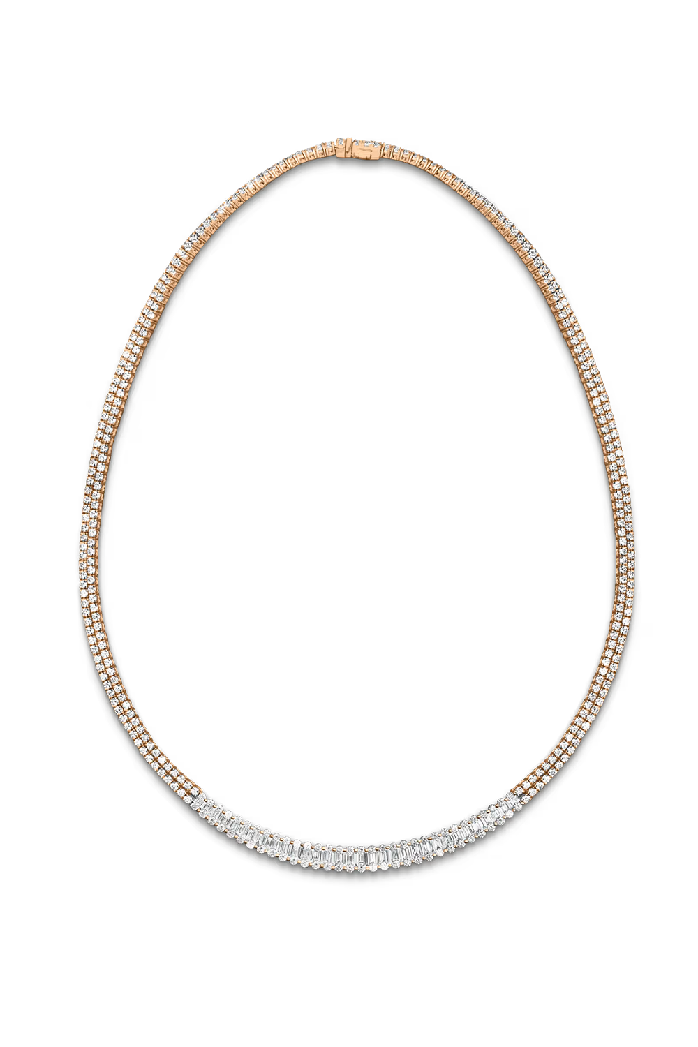 This Baguette Love collar necklace amplifies the dazzling depth of 65 baguette-cut diamonds with the warmth of 406... brilliant-cut diamonds encircling the neck. An exquisite 18-carat rose gold setting enhances the crisp shine to reveal a distinct dimensionality in this classic collar necklace.