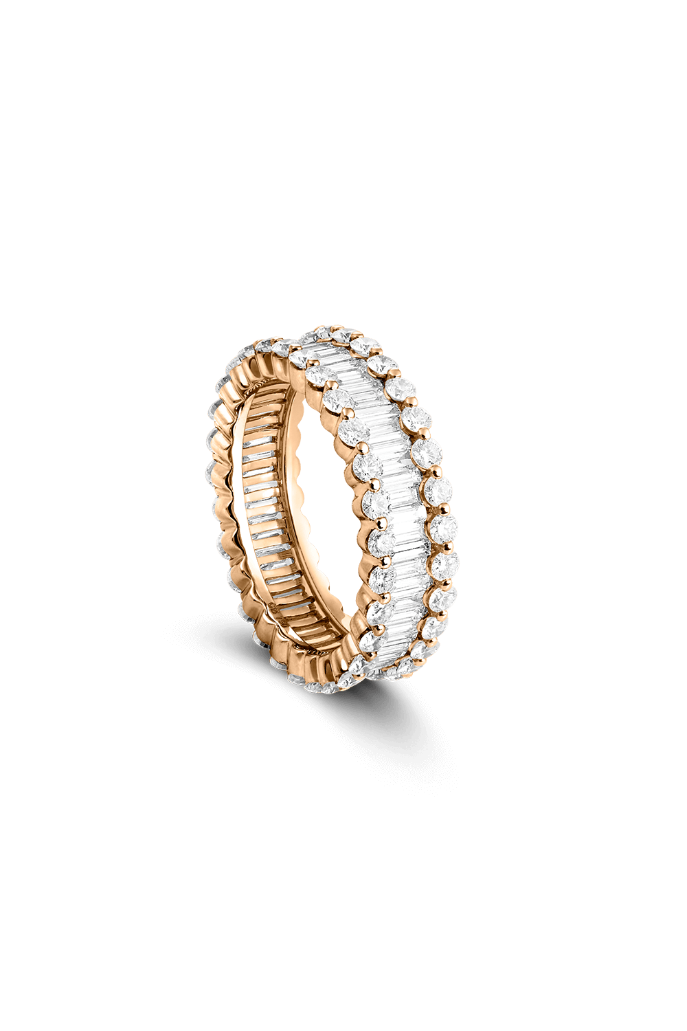 This Baguette Love ring amplifies the dazzling depth of 58 baguette-cut diamonds with the warmth of 58 brilliant-cut... diamonds. Exquisite 18-carat rose gold softens the crisp shine to reveal a distinct dimensionality in this classic ring.