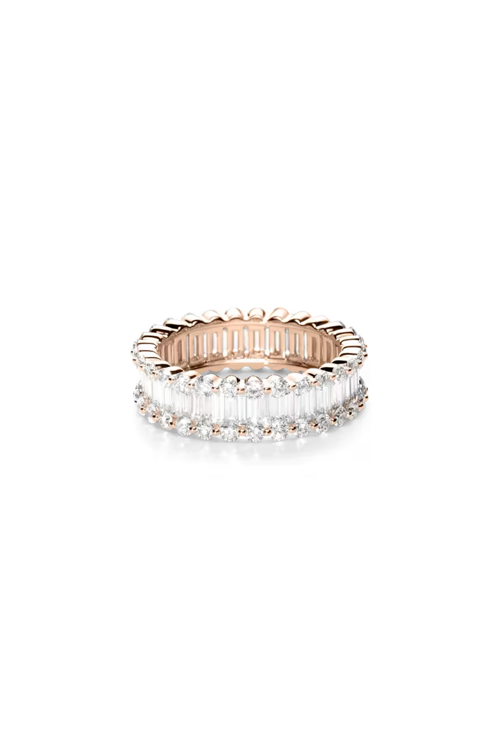 This Baguette Love ring amplifies the dazzling depth of 58 baguette-cut diamonds with the warmth of 58 brilliant-cut... diamonds. Exquisite 18-carat rose gold softens the crisp shine to reveal a distinct dimensionality in this classic ring.