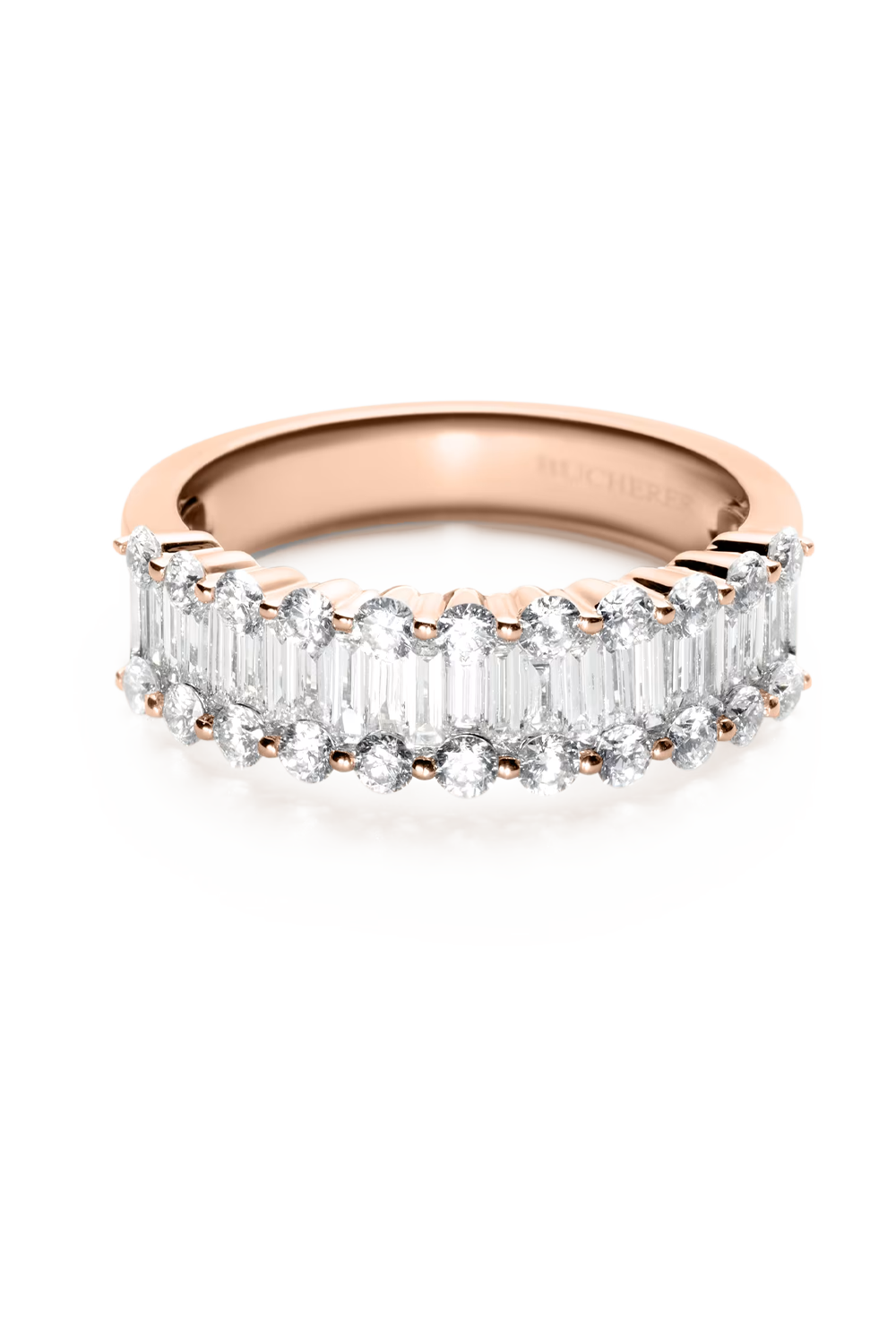 This Baguette Love ring amplifies the dazzling depth of 23 baguette-cut diamonds with the warmth of 22 brilliant-cut... diamonds. Exquisite 18-carat rose gold softens the crisp shine to reveal a distinct dimensionality in this classic ring.