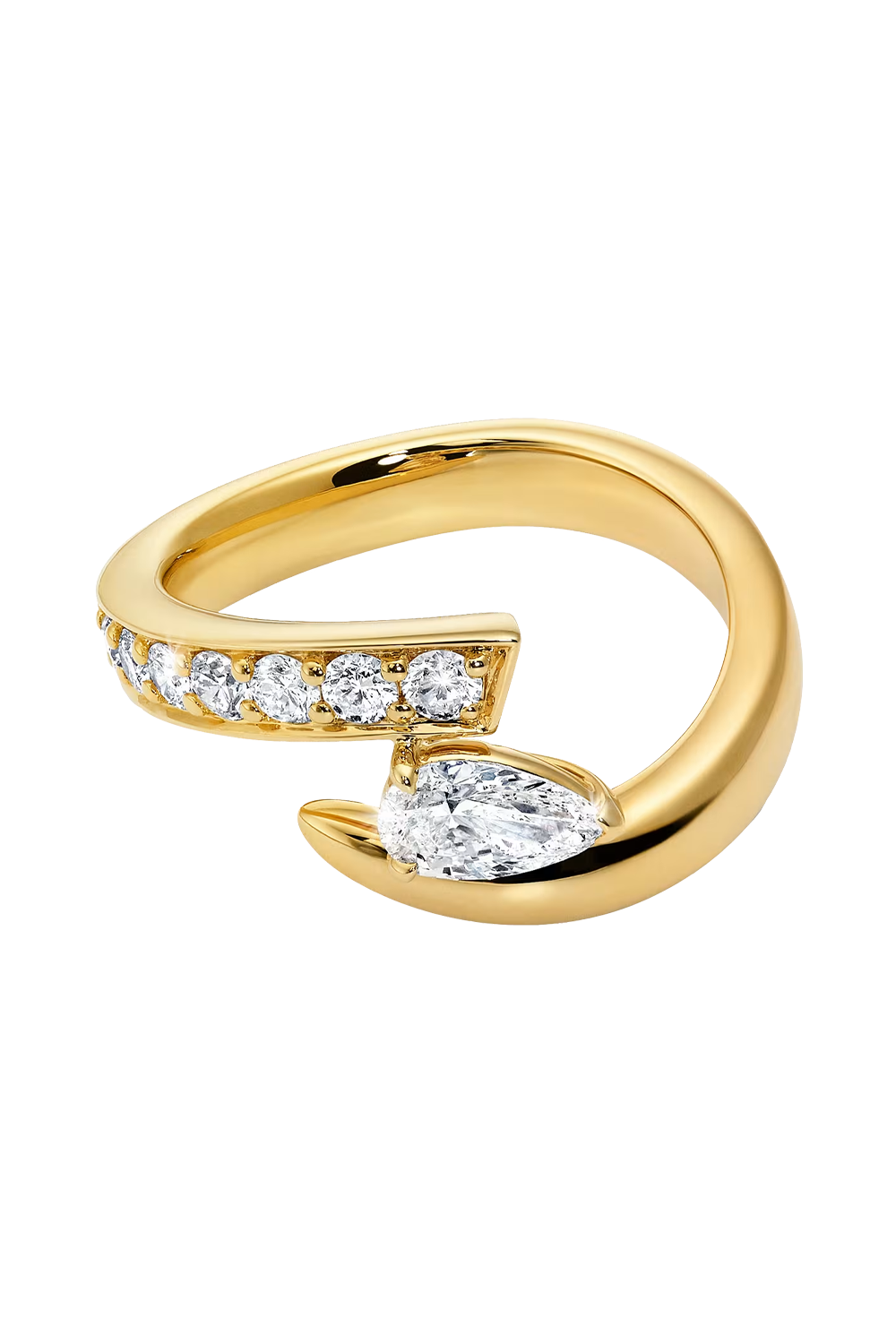 This Inner Fire Ring features 7 brilliant-cut diamonds set along the spiral of its 18K yellow gold band. A pear-cut... diamond sits at the center where both ends of this serpentine piece meet. This ring’s asymmetrical silhouette is bold and undeniably beautiful.