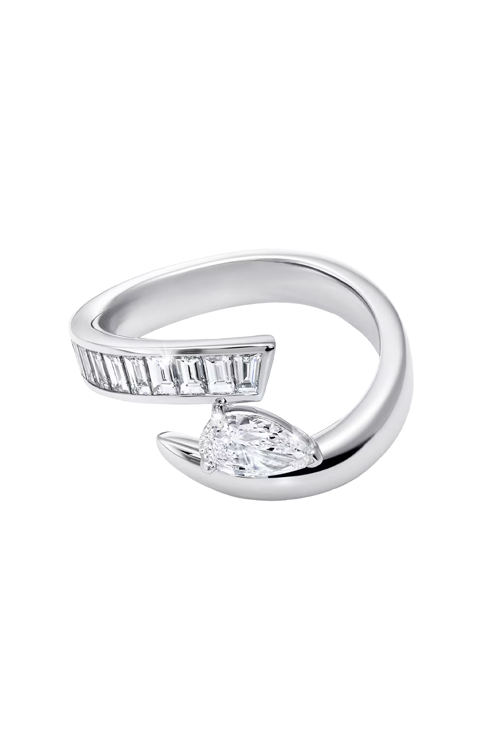 This Inner Fire Ring features 10 baguette-cut diamonds set along the spiral of its 18K white gold band. A pear-cut... diamond sits at the center where both ends of this serpentine piece meet. This ring’s asymmetrical silhouette is bold and undeniably beautiful.