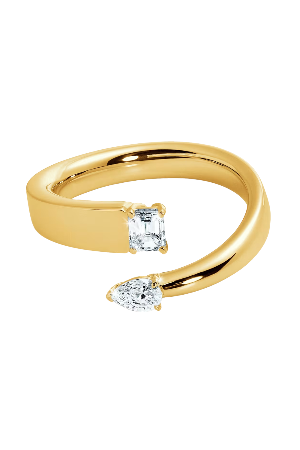 This Inner Fire Ring features a baguette-cut diamond and a pear-cut diamond set on opposite ends of a spiraling 18K... yellow gold band. This ring’s asymmetrical silhouette is bold and undeniably beautiful.
