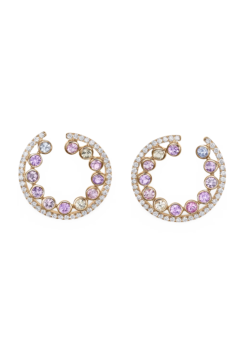 These Pastello Earrings capture the harmony of colors in nature with 24 round-cut sapphires in complementary... pastels set against 84 brilliant-cut diamonds. The rare shades are arranged and set in 18K Rose gold, bringing out the nuances of their fine color and emphasizing their natural beauty.