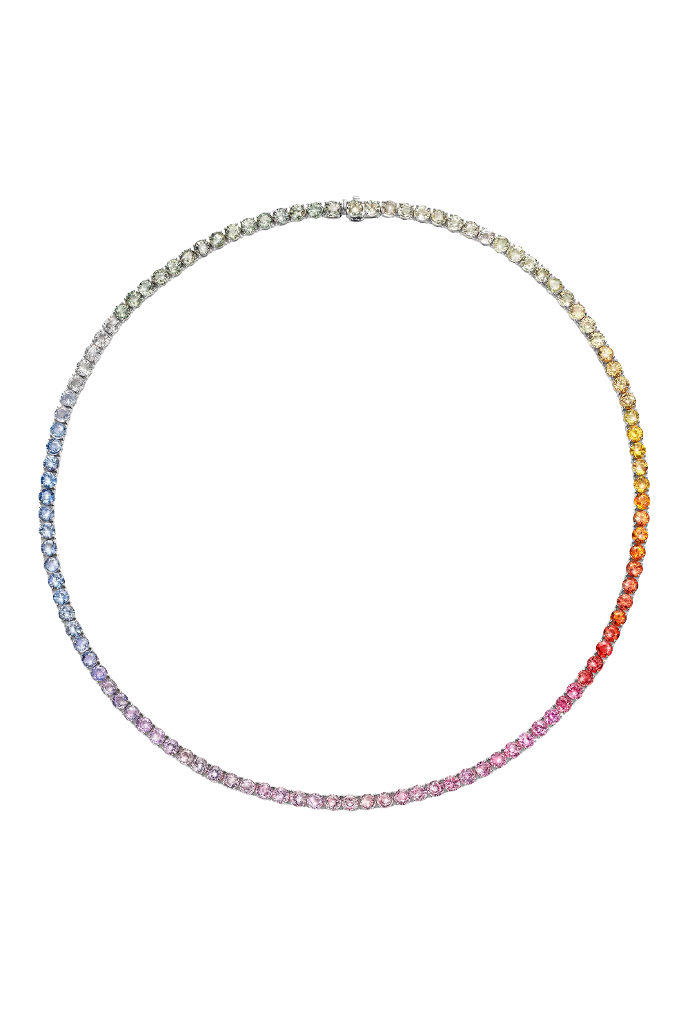 This Pastello Rainbow Riviere Necklace captures the radiance of the rainbow evident in the gradient of round-cut... sapphires set in a delicate strand. Set against the contrasting 18K white gold, this dynamic Rainbow Riviere necklace uses the natural beauty of each gemstone to make a statement of tranquility.