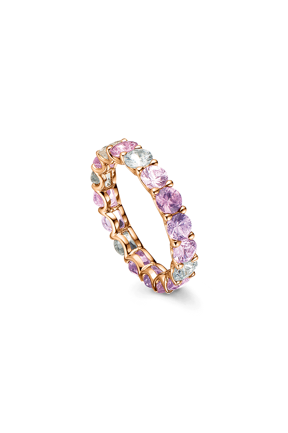 This Pastello ring captures the harmony of colors in nature with 16 round-cut sapphires in complementary pastels.... Arranged in a single band of rare shades set in 18K rose gold, this classic design brings out the nuances of fine color to emphasize natural beauty.
