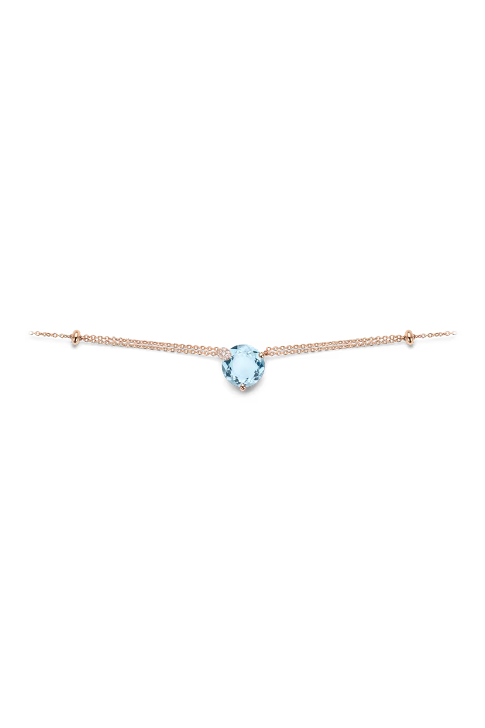 This Peekaboo Necklace showcases the refreshing color of its aquamarine center stone with additional shine from 9... diamonds in a pavé setting on the enlarged prong. The Peekaboo round cut optimizes the stone’s proportions, and is anchored beautifully in the center of the rose gold chain, creating a vibrant sparkle that’s exuberant, radiant and optimistic all at once.