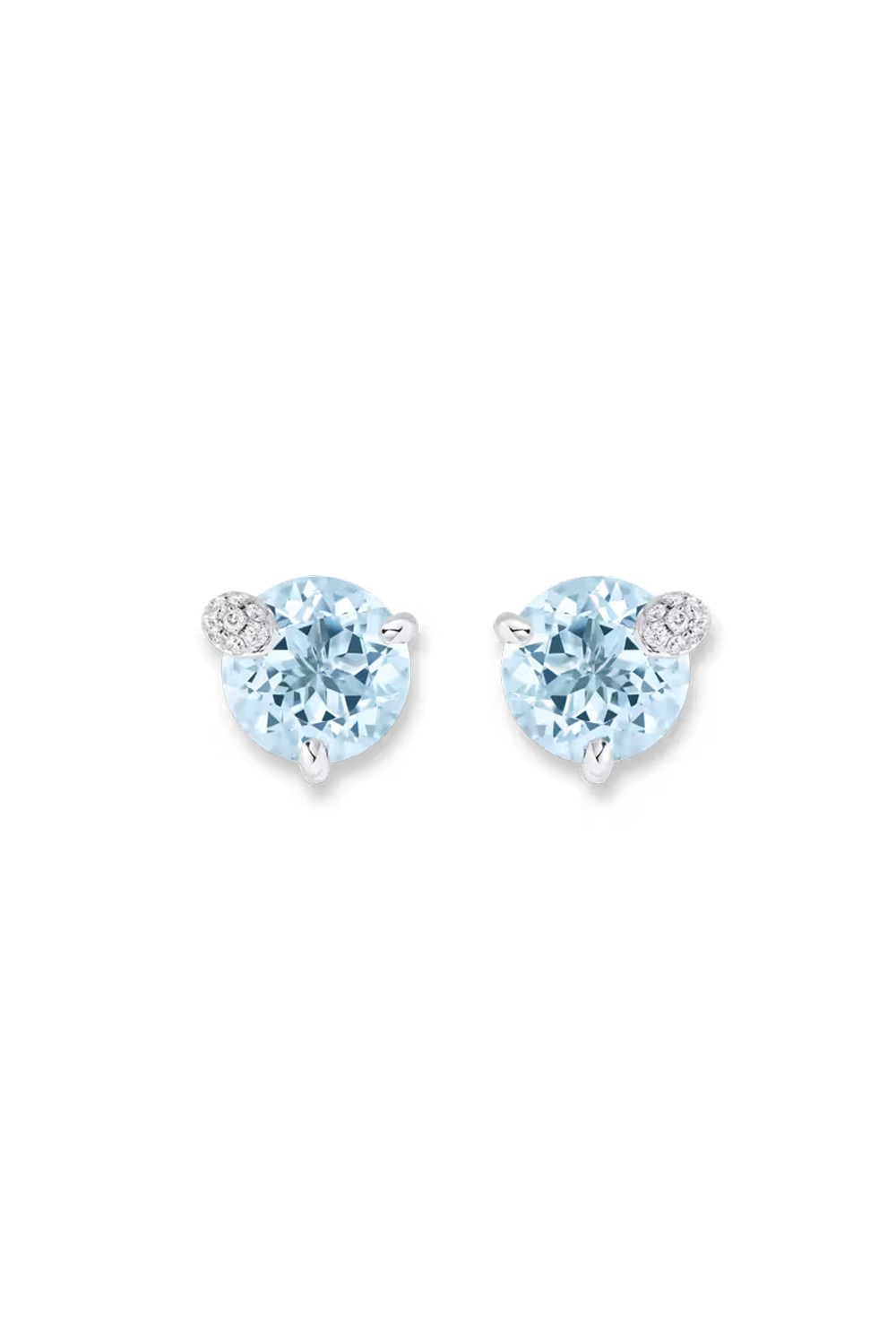 These Peekaboo Ear Studs showcase the refreshing color of the aquamarine center stones with additional shine from 18... diamonds in a pavé setting on the enlarged prongs. The Peekaboo round cut optimizes the stone’s proportions, and pairs beautifully with the white gold alloy of the setting, creating a vibrant sparkle that’s exuberant, radiant and optimistic all at once.