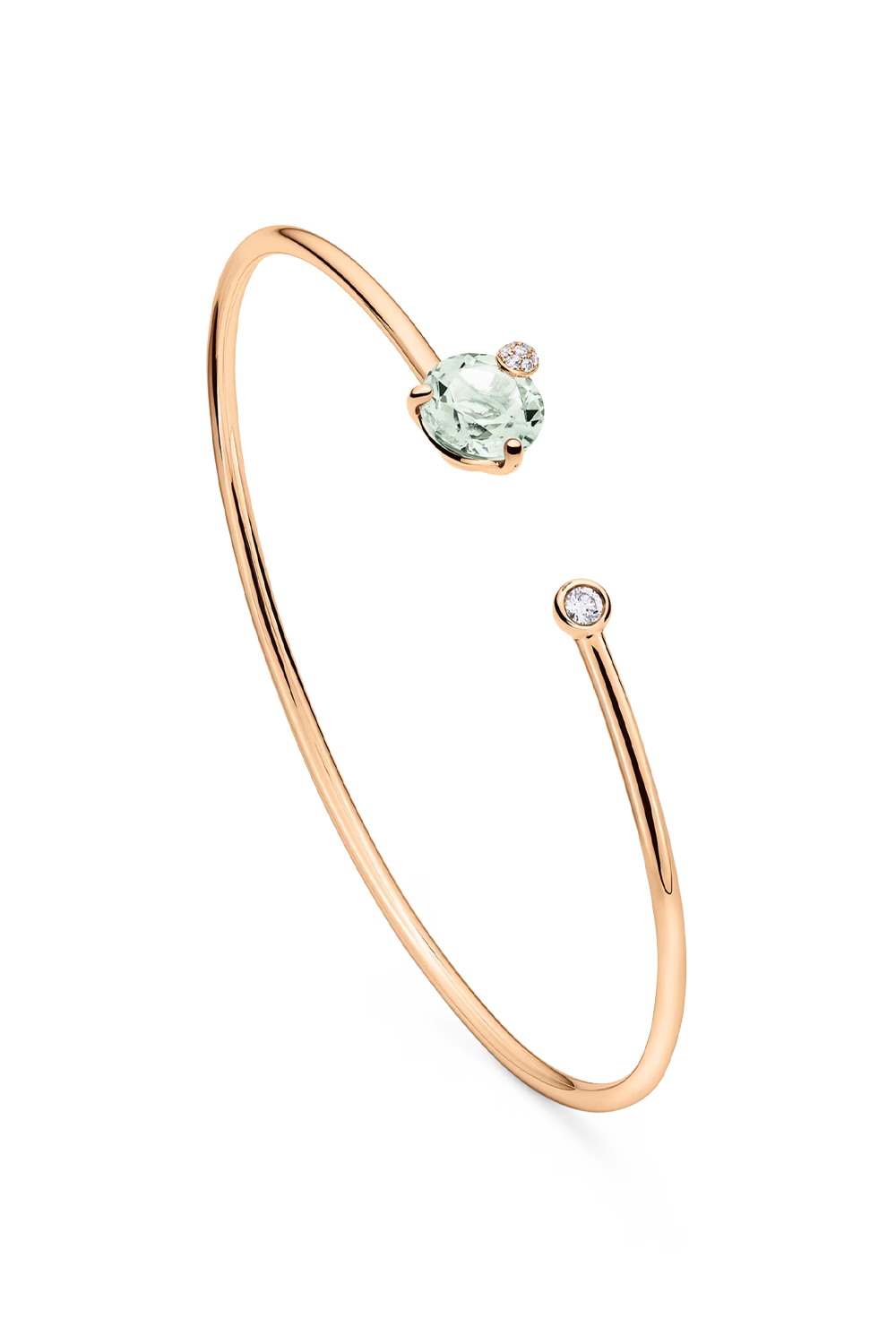 This Peekaboo Bangle showcases the refreshing color of the prasiolite hero stone with additional shine from 10... diamonds in a pavé setting on the enlarged prong. The Peekaboo round cut optimizes the stone’s proportions, and pairs beautifully with the rose gold alloy of the bangle, creating a vibrant sparkle that’s exuberant, radiant and optimistic all at once.