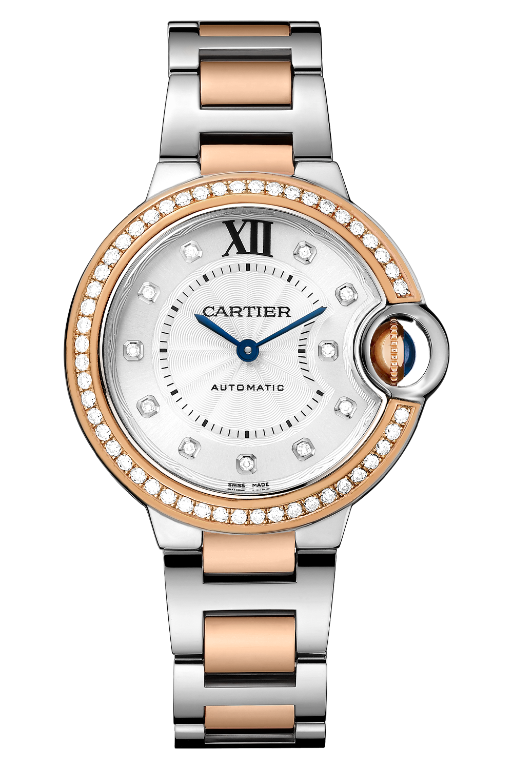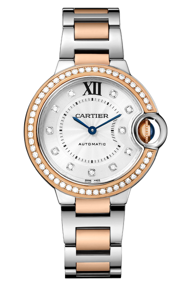 Ballon Bleu de Cartier watch, 33 mm, mechanical movement with automatic winding. Steel case, fluted rose gold... 750/1000 crown set with a cabochon synthetic spinel. Rose gold 750/1000 bezel and silver guilloché dial, set with 61 brilliant-cut diamonds totaling 0.63 carat. Blued-steel sword-shaped hands. Sapphire crystal. Rose gold 750/1000 and steel interchangeable bracelet. Case thickness: 10.16 mm. Water-resistant up to 3 bar (approx. 30 meters/100 feet).