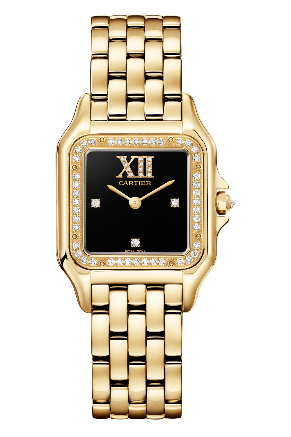 Panthère de Cartier watch, medium model, quartz movement. 18K yellow gold (750/1000) case set with 44 brilliant-cut... diamonds totaling 0.28 carats. Dimensions: 36.5 mm x 26.7 mm, thickness: 6.8 mm. 18K yellow gold (750/1000) octagonal crown set with a brilliant-cut diamond totaling 0.02 carats. Black lacquer dial set with 15 brilliant-cut diamonds totaling 0.03 carats, golden-finish sword-shaped hands. 18K yellow gold (750/1000) bracelet. water-resistant up to 3 bar (approx. 30 meters/100 feet).
