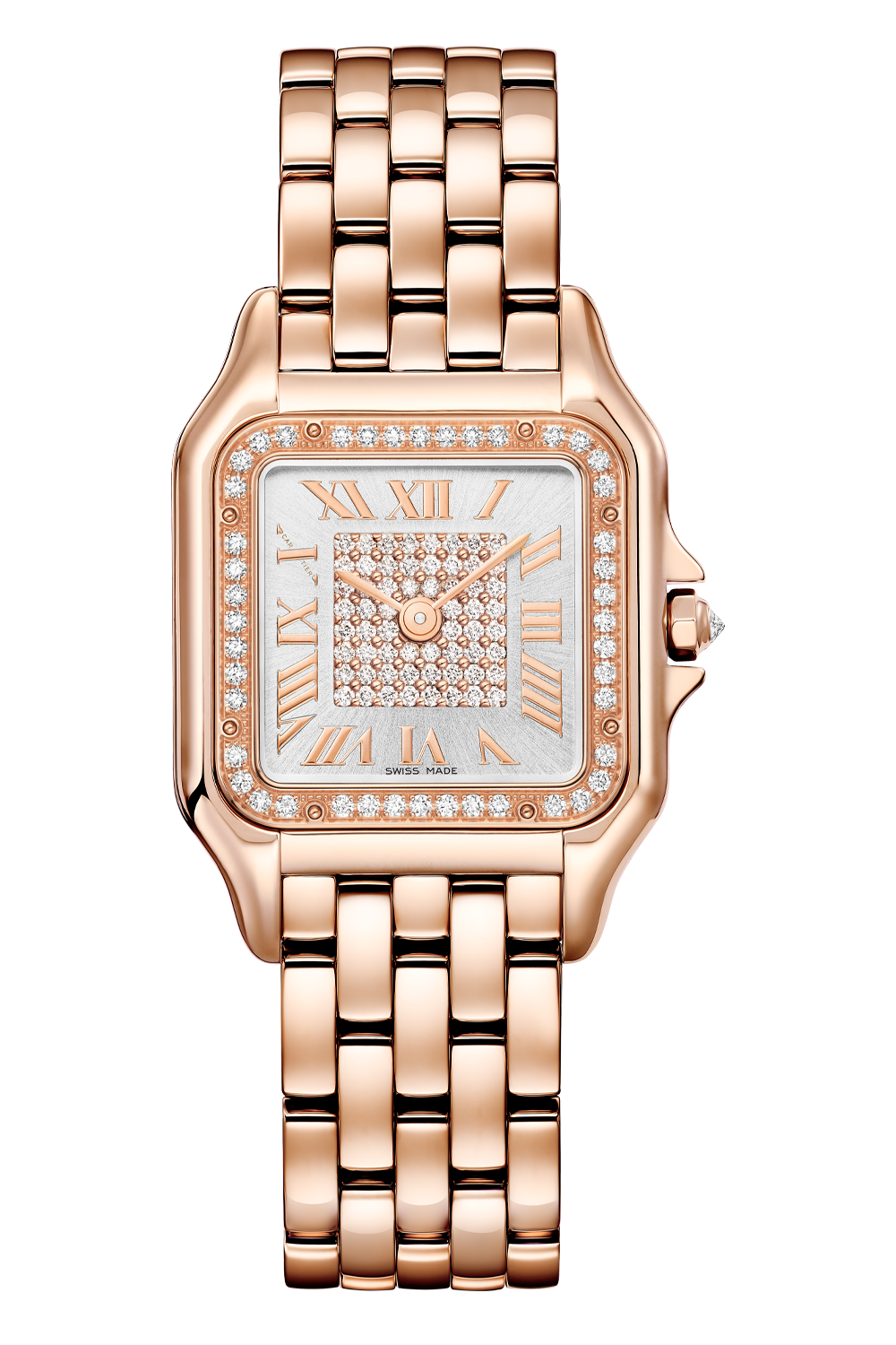 Panthère de Cartier watch, medium model, quartz movement. 18K rose gold (750/1000) case set with 44 brilliant-cut... diamonds totaling 0.28 carats. Dimensions: 36.5 mm x 26.7 mm, thickness: 6.8 mm. 18K rose gold (750/1000) octagonal crown set with a brilliant-cut diamond totaling 0.02 carats. Silvered sunray-brushed dial set with 60 brilliant-cut diamonds totaling 0.22 carats, rose gold-finish sword-shaped hands. 18K rose gold (750/1000) bracelet. Water-resistant up to 3 bar (approx. 30 meters/100 feet).