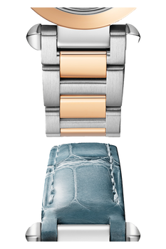 Pasha de Cartier watch, 30 mm, high autonomy quartz movement. Steel case, 18K rose gold (750/1000) bezel, fluted... crown cap and crown set with synthetic spinels, opaline flinqué dial, blued steel diamond-shaped hands, bracelet in 18K rose gold (750/1000) and steel, second strap in blue alligator leather, interchangeable steel deployant buckle. Both bracelets are fitted with the "QuickSwitch" interchangeability system. Case diameter: 30 mm, thickness: 8.22 mm. Water-resistant up to 3 bar (approx. 30 meters/100 feet).