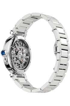 Pasha de Cartier watch, 41 mm, skeleton, mechanical movement with automatic winding, caliber 9624 MC. Steel case,... fluted crown cap and crown set with sapphires, blued-steel diamond-shaped hands, steel bracelet with "SmartLink" adjustment system, second strap in dark gray alligator skin, interchangeable steel deployant buckle. Both bracelets are fitted with the "QuickSwitch" interchangeability system. Hours and minutes with skeletonized bridges forming Arabic numerals. Movement consisting of 172 parts including 28 rubies. Movement diameter: 31.63 mm, movement thickness: 5.66 mm, balance: 28,800 vibrations/hour, power reserve approx. 48 hours. Case diameter: 41 mm, thickness: 10.45 mm. Water-resistant to 3 bar (approx. 30 meters/100 feet).