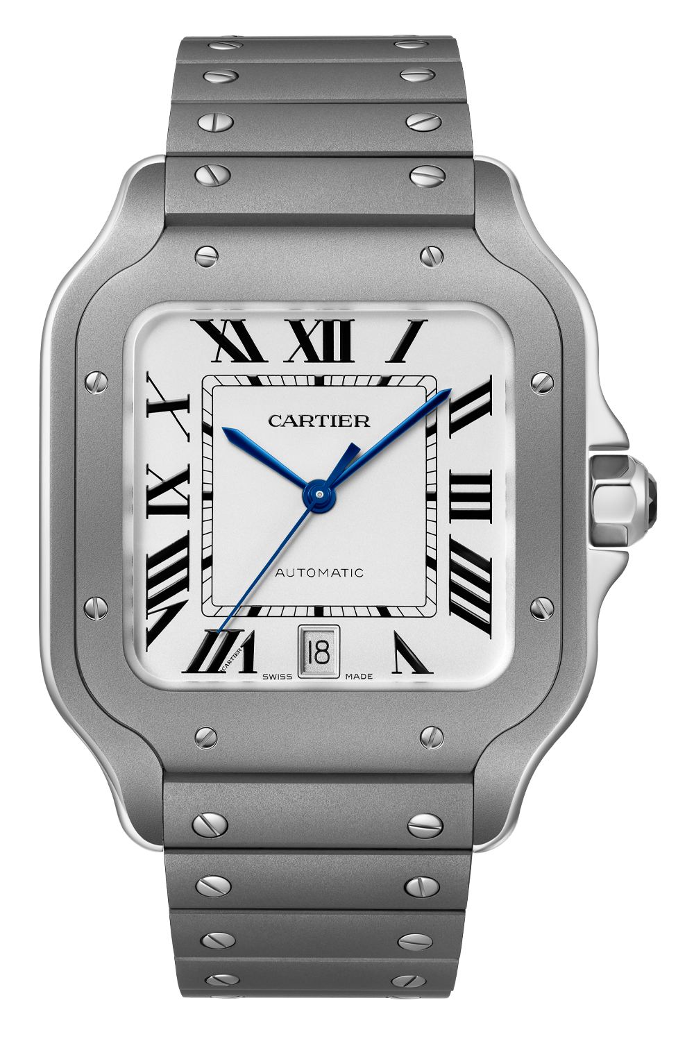 Santos watch, large model, mechanical movement with automatic winding, caliber 1847 MC. Titanium case, 7-sided... crown set with a black faceted synthetic spinel, silvered opaline dial, blued-steel sword-shaped hands, sapphire crystal. Titanium bracelet. Second strap in nubuck alligator leather, with interchangeable folding steel buckle. Both are fitted with the "QuickSwitch" interchangeability system. Case width: 39.8 mm, thickness: 9.38 mm. Water-resistant up to 10 bar (approx. 100 meters/330 feet).