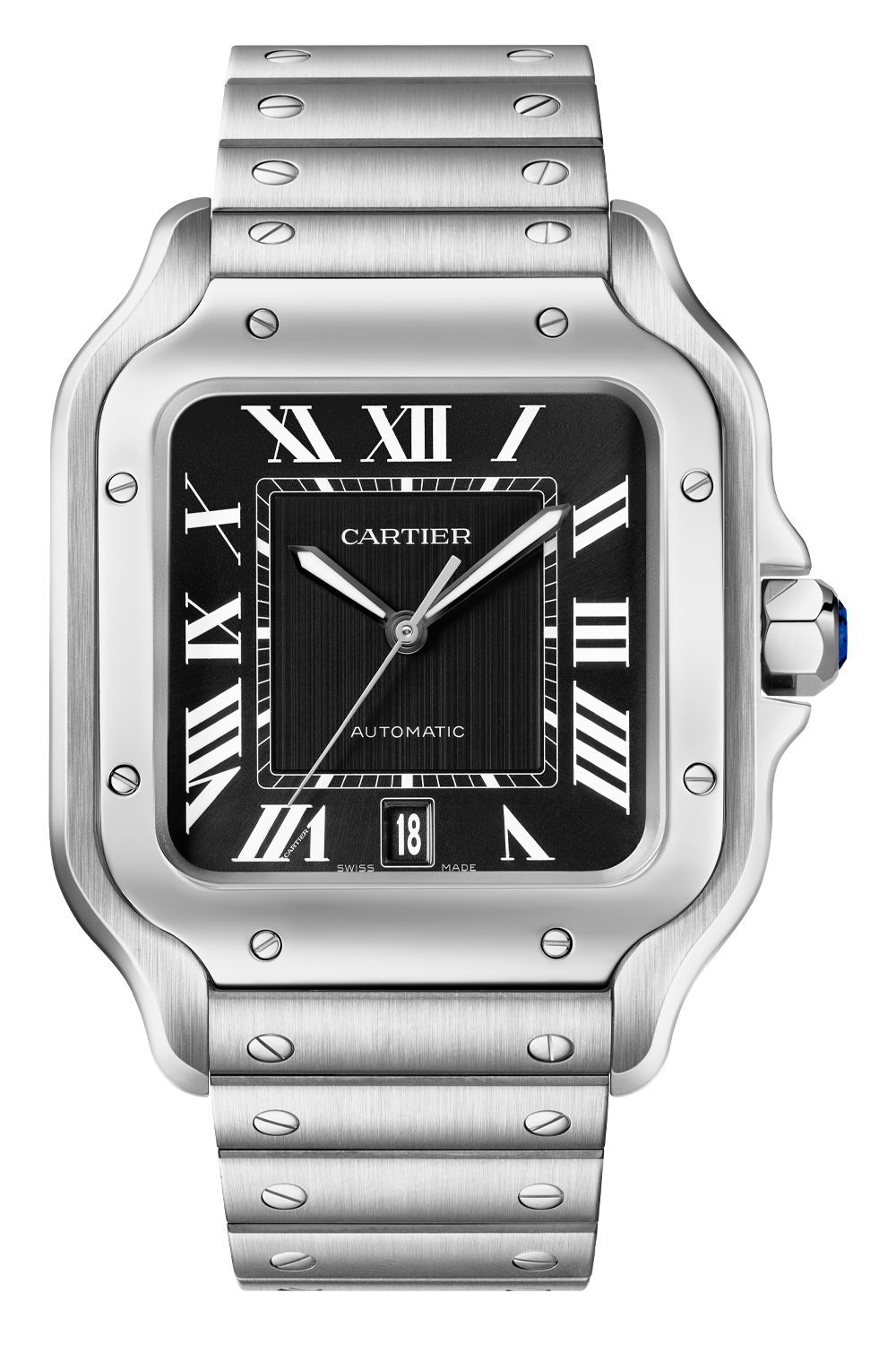 Santos watch, large model, mechanical movement with automatic winding, caliber 1847 MC. Steel case, 7-sided crown... set with a synthetic faceted spinel, black dial, black steel sword-shaped hands with luminescent material, sapphire crystal. Steel bracelet with "SmartLink" adjustment system. Second strap in nubuck alligator leather, with interchangeable steel deployant buckle. Both are fitted with the “QuickSwitch” interchangeable system. Case width: 39.8 mm. Thickness: 9.38 mm. Water-resistant up to 10 bar (approx. 100 meters/330 feet).