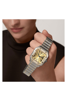 A modern marvel as one of the first ever wristwatches at the time of its invention in 1904, the Santos de Cartier has evolved into a true icon. It was created by Louis Cartier for the famous Brazilian aviator Alberto Santos Dumont, who wished to tell time while flying. The recognizable design, defined by rounded angles in the dial, a seamless curve of the horns and exposed screws, has inspired countless reinterpretations over the past century.