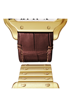 Santos watch, medium model, mechanical movement with automatic winding, calibre 1847 MC. Yellow gold 750/1000... case, yellow gold 750/1000 7-sided crown set with a faceted sapphire, silvered opaline dial, blued-steel sword-shaped hands, sapphire crystal. Yellow gold 750/1000 bracelet with “SmartLink” adjustment system. Second bracelet in alligator skin, with interchangeable yellow gold 750/1000 folding buckle. Both bracelets are fitted with the “QuickSwitch” interchangeability system. Case width: 35.1 mm, thickness: 8.83 mm. Water-resistant to 10 bar (approx. 100 metres).
