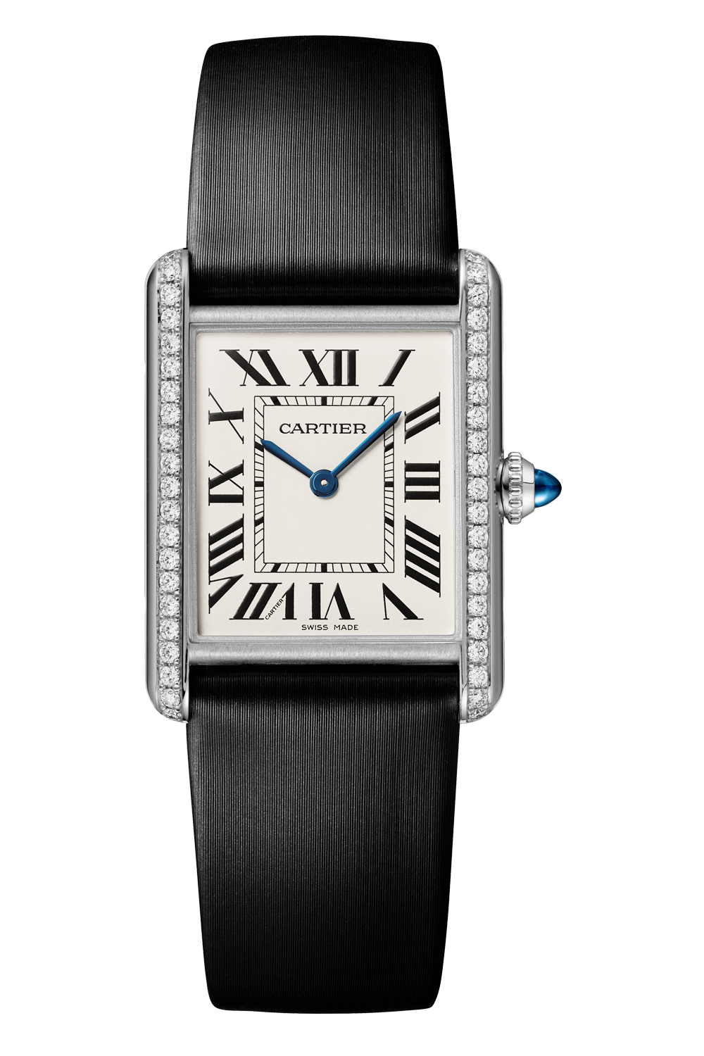 Tank Must watch, large model, High Autonomy quartz movement. Steel case, bezel set with 42 brilliant-cut diamonds... totaling 0.48 carats, beaded crown set with a synthetic cabochon-shaped spinel, silvered dial, blued-steel sword-shaped hands, interchangeable black brushed calfskin strap, steel ardillon buckle. Case dimensions: 33.7 x 25.5 mm, thickness: 6.6 mm. Water-resistant up to 3 bar (approx. 30 meters/100 feet).
