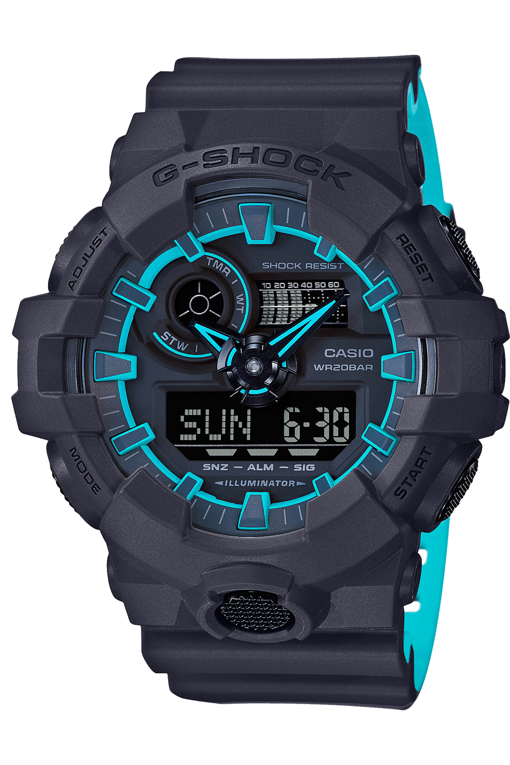 An all new collection of Layered Neon Color models based on the GA-700, whose front button and big case creates a bold... design, are available in new color combinations. The overall coloring of these models is matte black, accented by colors that can often be seen on sneakers, caps, and other must-have street fashion items. Accent colors between the hour markers look great and maximize readability. The band is molded with different colors for the inside and outside surfaces of the band and even the hour markers feature distinctive coloring.