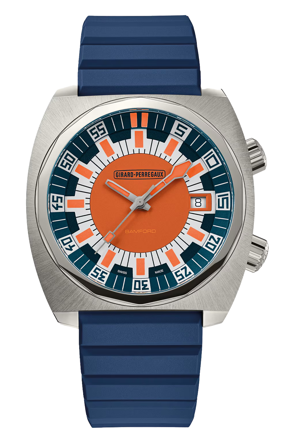 standout watch that merged bold design with the revolutionary Gyromatic system - a mechanical marvel of its era. The Deep Diver’s defining characteristics included a 14-facet bezel and a striking red dial, which made it instantly recognizable. Its case design foreshadowed the signature geometry later seen in the iconic Laureato. Today, in collaboration with Bamford Watch Department, this recognizable model makes a triumphant return as part of Girard Perregaux’s limited-edition series: the Legacy Editions.