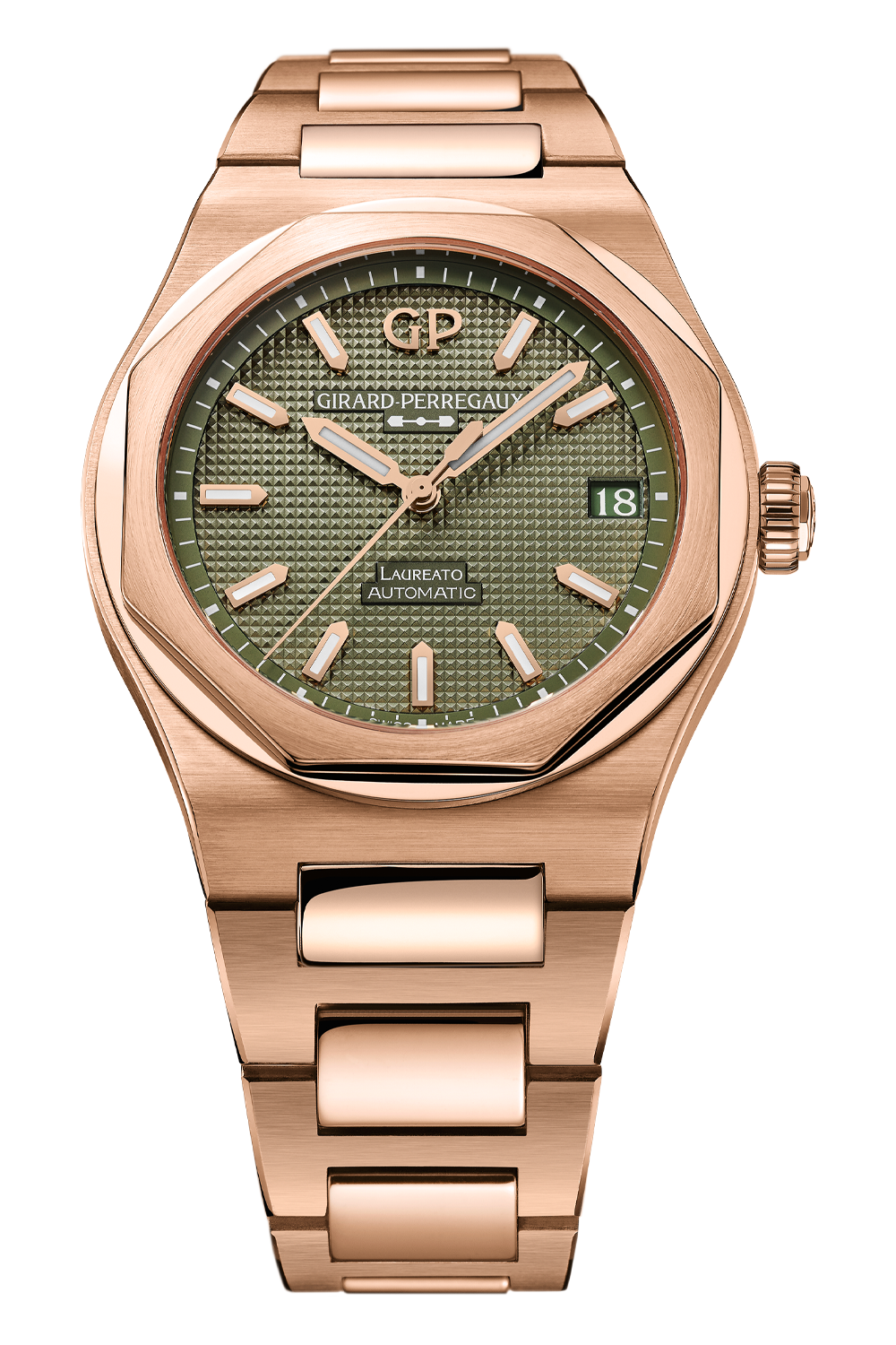 The Girard-Perregaux Laureato adds two new chapters in a story that began in 1975, this time housed in a sumptuous 42mm... Pink Gold case and upholding Laureato tradition of contrasting shapes and finishes. On this occasion, the eponymous noble metal is paired with bewitching Sage Green and Ultramarine Blue dials that appear to change shade when viewed from different angles.