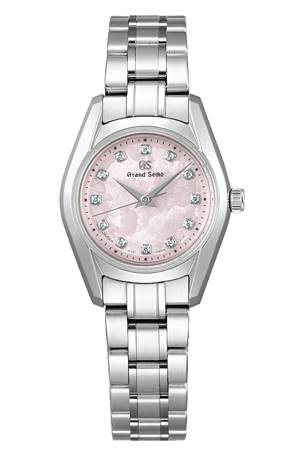 A new 26mm quartz model enhances the 62GS lineup with the option of a discreetly elegant size. The original 62GS... launched in 1967 and debuted Grand Seiko’s first automatic movement, becoming one of Grand Seiko’s most memorable timepieces. Reinterpreting this timeless design, this model uses a dial that expresses the unique seasonal changes of Japan. It evokes Hana-Ikada, the beautiful “flower raft” scene in which cherry blossom petals are swept from their branches by spring breezes before settling on river surfaces. As with the original 62GS, a bezel-free construction grants the dial an expansive appearance, with the Zaratsu polishing technique creating a striking, multifaceted case design. Despite the case’s small size, its design ensures perfect legibility. The symmetrically arranged diamonds contribute to the watch’s brilliance, and the movement inside is the quartz Caliber 4J51, which achieves an accuracy of ±10 seconds per year.