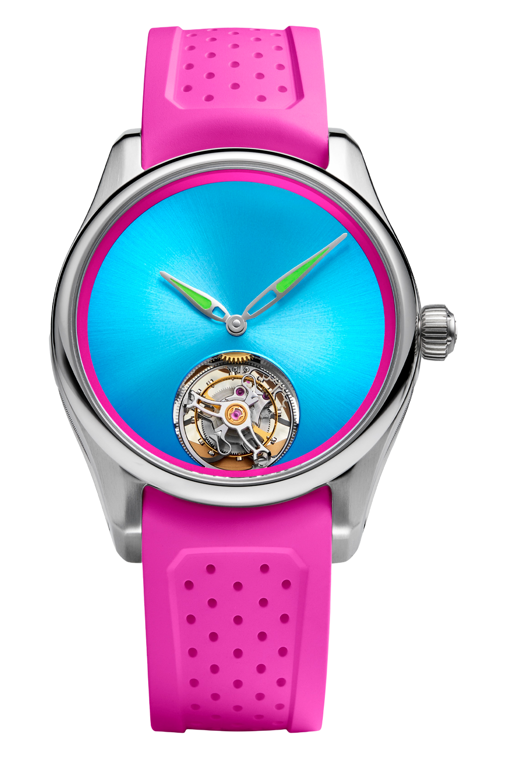 that captures the vibrant spirit of one of the world’s most flamboyant cities. Crafted exclusively for Bucherer and limited to just 28 pieces, this distinctive timepiece pairs Moser’s fiercely independent approach to high watchmaking with a striking blue fumé dial, pink accents and a one-minute flying tourbillon – all housed in a refined 40 mm steel case.True to H. Moser & Cie.’s philosophy, the Pioneer Tourbillon Miami makes no compromises: every detail speaks to precision, individuality and a quiet confidence that sets it apart. A rare opportunity to own a piece where contemporary audacity meets centuries-old horological mastery.