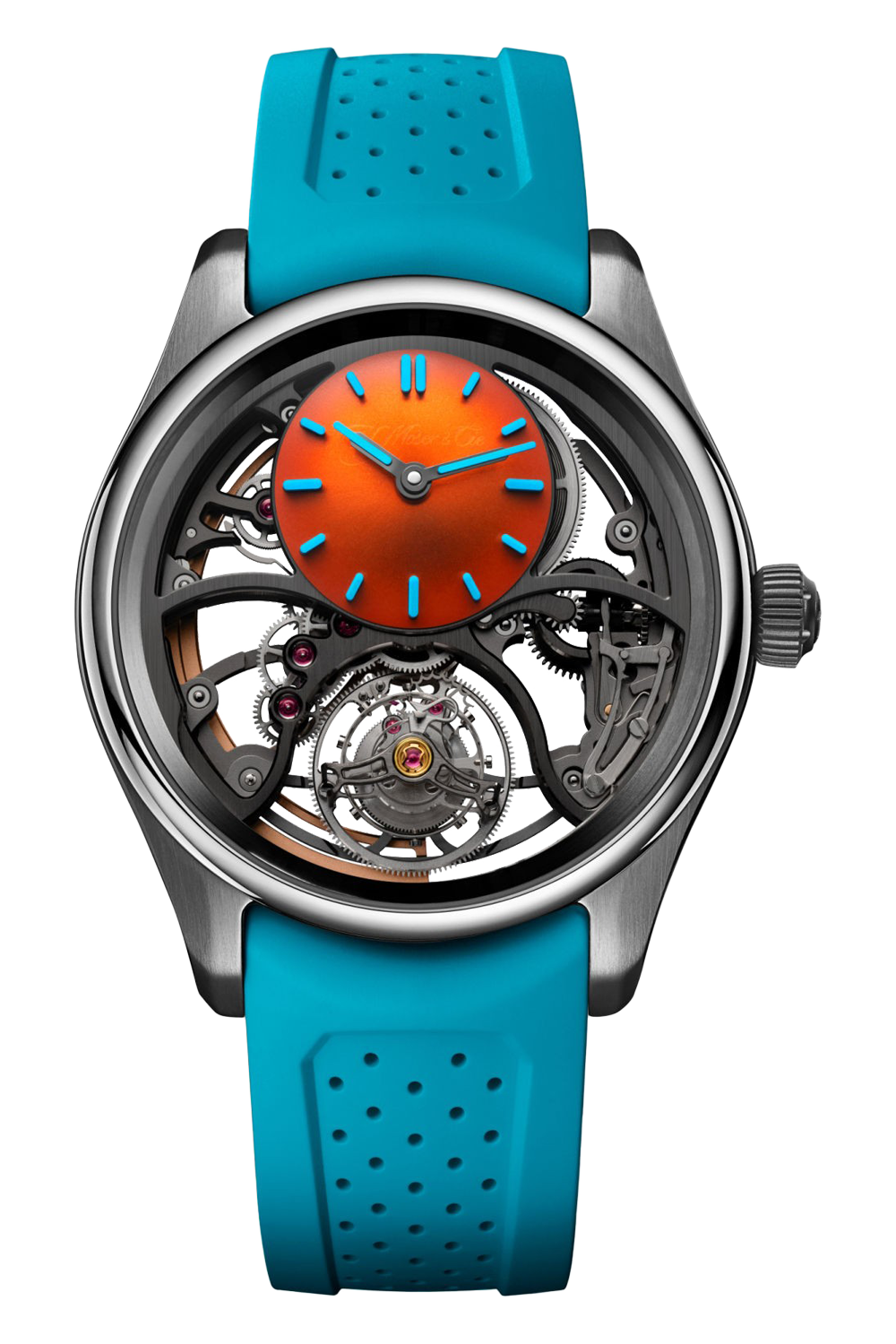 Bold, bare, and beautiful, the Pioneer Cylindrical Tourbillon Skeleton Spiced Aqua hides nothing. Its open... architecture houses the skeleton HMC 811 calibre. At its heart lies a flying tourbillon with a cylindrical hairspring, designed and produced in-house. The watch’s luminescence comes from the orange domed subdial, which floats just above the fully skeletonised dial. More than a timepiece, this is a shimmering sculpture. A technical manifesto. A declaration of independence.