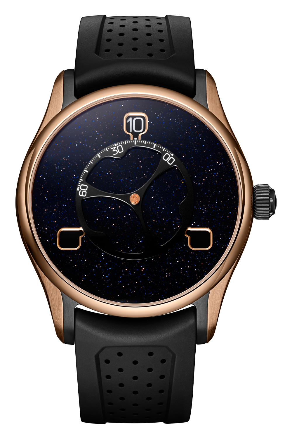 Ever seen hours dance? The Pioneer Flying Hours in 5N red gold with black DLC-treated titanium is as rare as it is... spectacular, limited to just 100 pieces. Housed in a 42.8 mm case, its stunning aventurine dial shimmers like a star-filled sky, where three satellites orbit around a skeletonised central minutes disc. Inside beats the HMC 240 calibre, which powers the remarkable instantaneous display, transforming each passing hour into a moment of pure theatre.