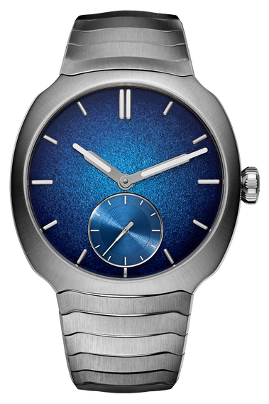 A new expression of sporty-chic with an emphasis on craftsmanship and proportions. The H. Moser & Cie. Streamliner... Small Seconds features a translucent Aqua Blue fumé Grand Feu enamel dial, housed in a new slim 39mm steel case with integrated bracelet. Equipped with the contemporarily finished HMC 500 automatic micro-rotor manufacture movement.