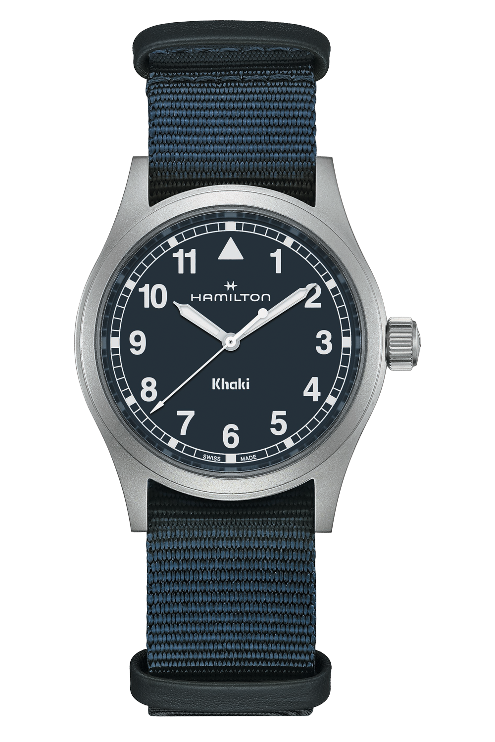The Khaki Field Quartz expresses a return to Hamilton's military heritage through simplicity in design. The dial... features a clear typography with straighter Arabic numerals and a "railway" minute track. The color palette is understated, with its sleek blue dial highlighted by white Super-LumiNova® indexes. The watch comes with a blue textile NATO strap and blue leather loops - perfect for your next adventure out in the field.