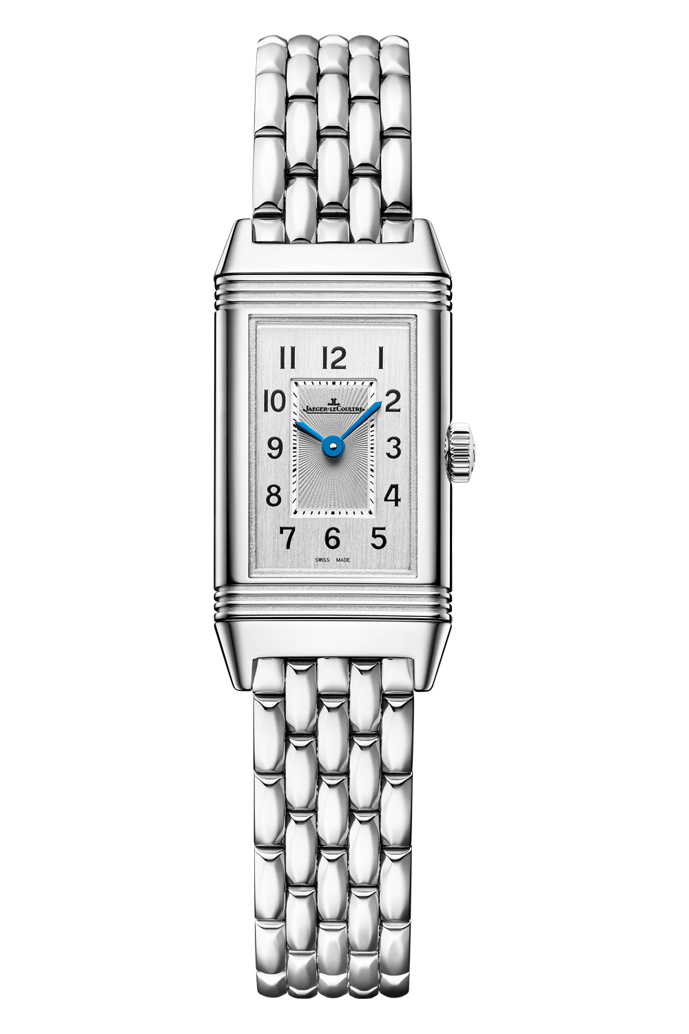 Inspired by the first women’s models of the 1930s, the Reverso Classic Monoface Origin is very understated. The blued... Dauphine hands stand out against a monochrome background. On the dial, with its double guilloché and vertically brushed finish, the Art Deco codes emblematic of the Reverso form a harmonious balance: gadroons on either side of the steel case, minute track in the centre, arabic hour numerals. The reverse can be personalised by engraving and lacquering. A steel link bracelet completes this timelessly elegant timepiece.