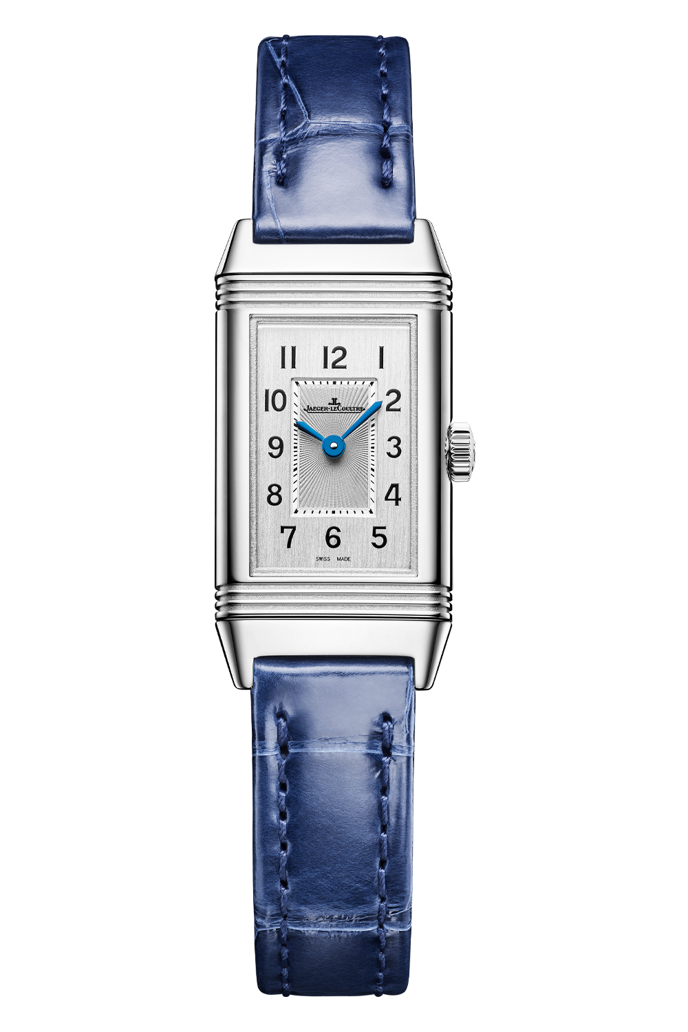 The Reverso Classic Monoface Origin, with its slim rectangular silhouette (16.3 mm wide), recalls the proportions... of the first women’s Reverso cases from the 1930s. Equipped with a quartz movement, the watch displays the Hour & Minute functions on a very pure front, enhanced by the double finish of the dial, guilloché on the inside and vertically brushed on the outside. The silver-coloured dial hosts 12 arabic numerals and blued Dauphine hands echoing the blue of the subtly shiny alligator leather strap. As the name suggests, the reverse of the watch can be personalised by engraving a motif, a date or initials.