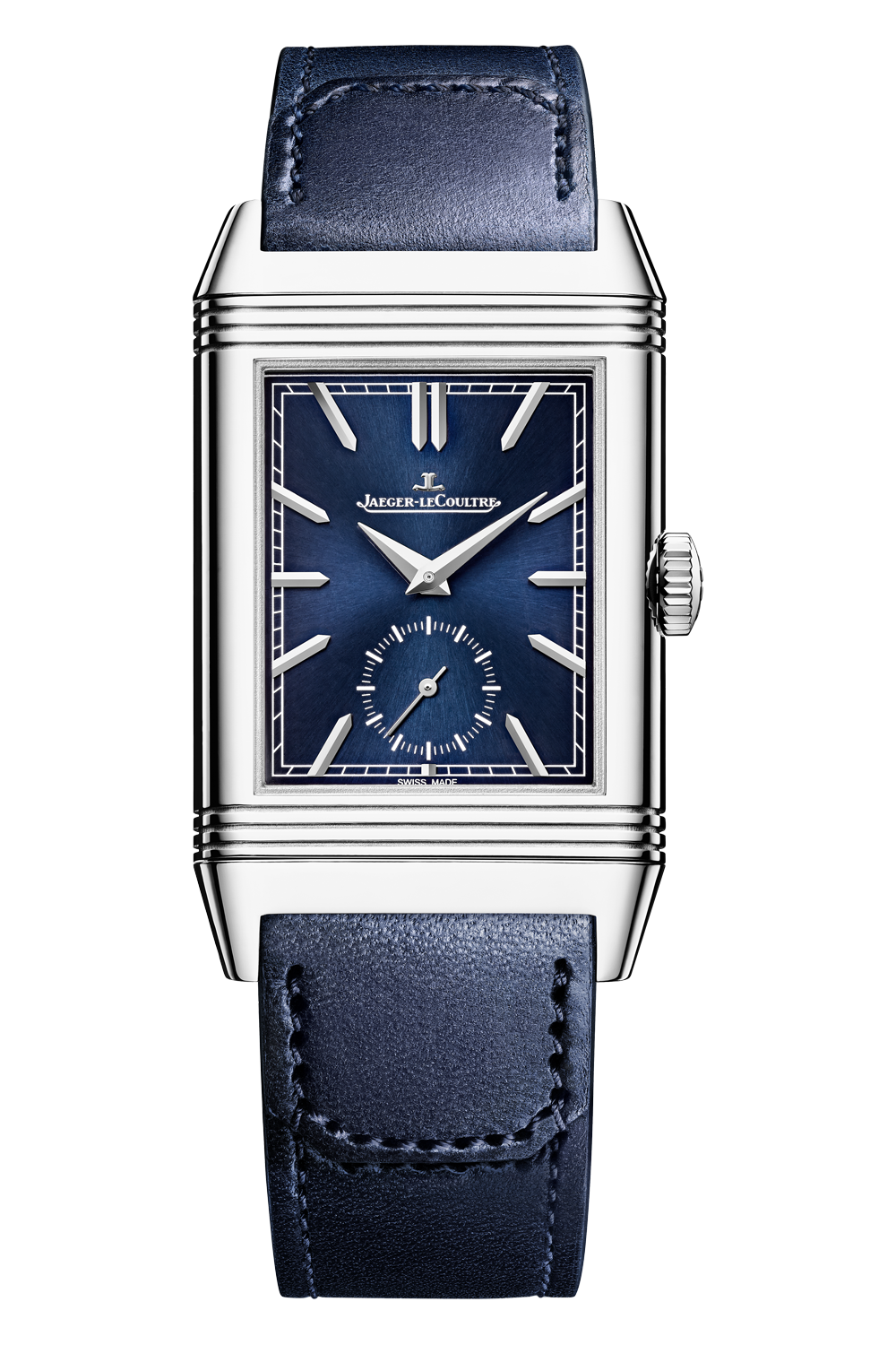 Featuring the Duoface complication, the Reverso Tribute Duoface Small Seconds watch is inspired by the Art Deco... codes of the very first models from 1931. On the front, the sunray-lacquered blue dial clearly displays its attributes and functions: railroad minute track, trapezoidal applied indexes, Dauphine hands and small seconds at 6 o’clock. On the reverse, the sunrayed silver dial gives way to a Night & Day indicator centred at 6 o’clock. The second time zone is easily set by means of a trigger on the side of the steel case. The watch is equipped with two bracelets designed by Casa Fagliano: the first in blue leather, the second in the same colour, leather and canvas.