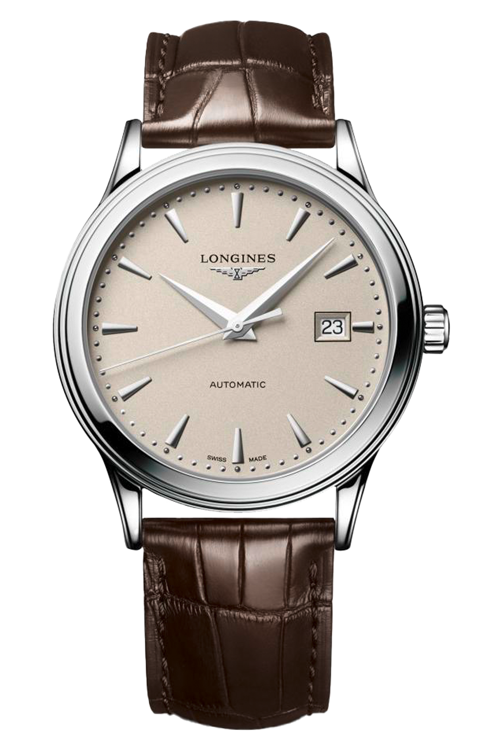 The Flagship celebrates the golden age of traditional mechanical watchmaking. A refined timepiece, the highest stylistic standards of the Longines repertoire are evident throughout.