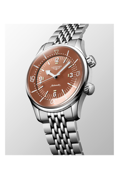 Originally designed for underwater exploration, the Longines Legend Diver is equally at home on land or... underwater. With its timeless design and cutting-edge performance, it has been a true icon of watchmaking since 1959.  At first glance, it is distinctive because of its two crowns and internal rotating bezel. Invented by Longines, the position of the bezel inside the case protects it from accidental manipulation and shocks that could alter its settings. These true tool watches are powered by exclusive Longines calibres equipped with a silicon balance-spring. The collection is available in a range of sizes, materials and colours.