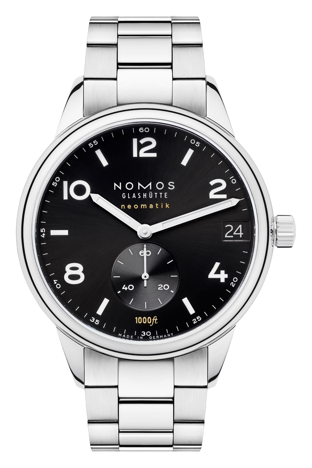 An entirely new version of Club—with a sense of adventure: this large NOMOS watch is water resistant to 1000 ft, or 30... atm. Equipped with the highly innovative and exceptionally precise neomatik date caliber and the new NOMOS bracelet, Club Sport neomatik 42 date black is a watch for the most modern of wrists.