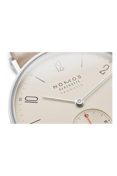 The NOMOS classic with the new NOMOS neomatik caliber is now automatic and yet strikingly slender. Here the watch is... champagne-colored, while the minute markers in neon orange appear as delicate pops around the edge. On the automatic NOMOS caliber DUW 3001, clearly visible through the sapphire crystal glass: Glashütte ribbing, the three-quarter plate, NOMOS perlage.