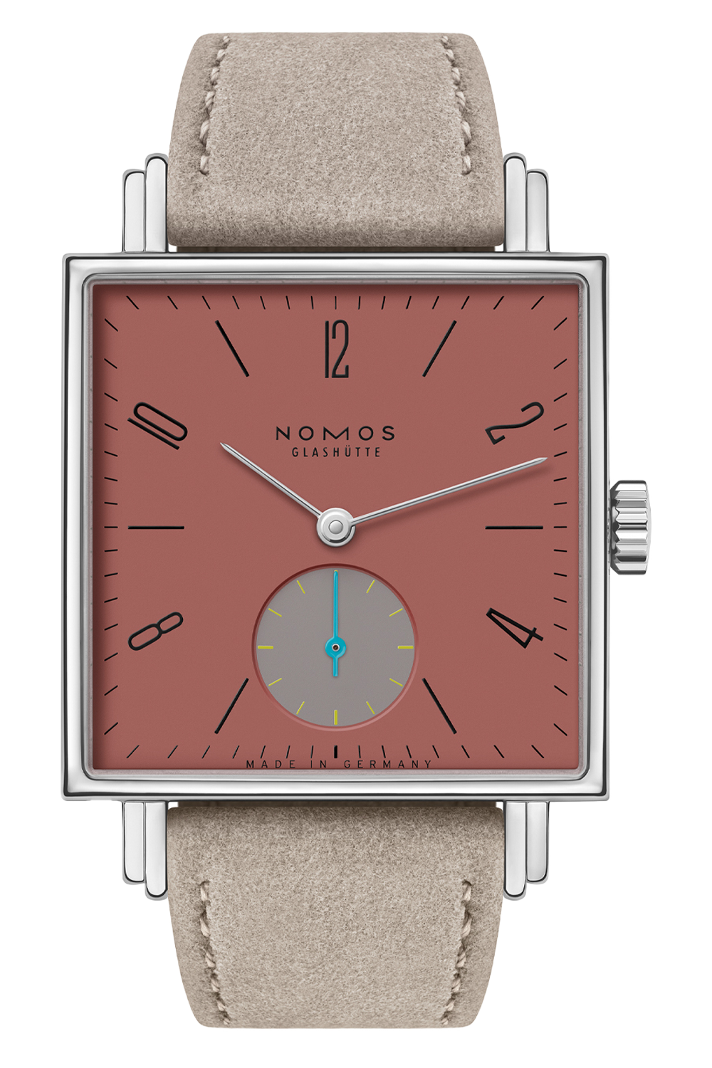 The earthy red hue of this dial evokes a sense of grounded strength, while its square case provides a modern frame.... Contrasting color accents in the sub-seconds dial create an appealingly complex palette. Powered by German mechanics, namely the hand-wound DUW 4001 caliber, this watch is both a statement and a reliable companion on the wrist.