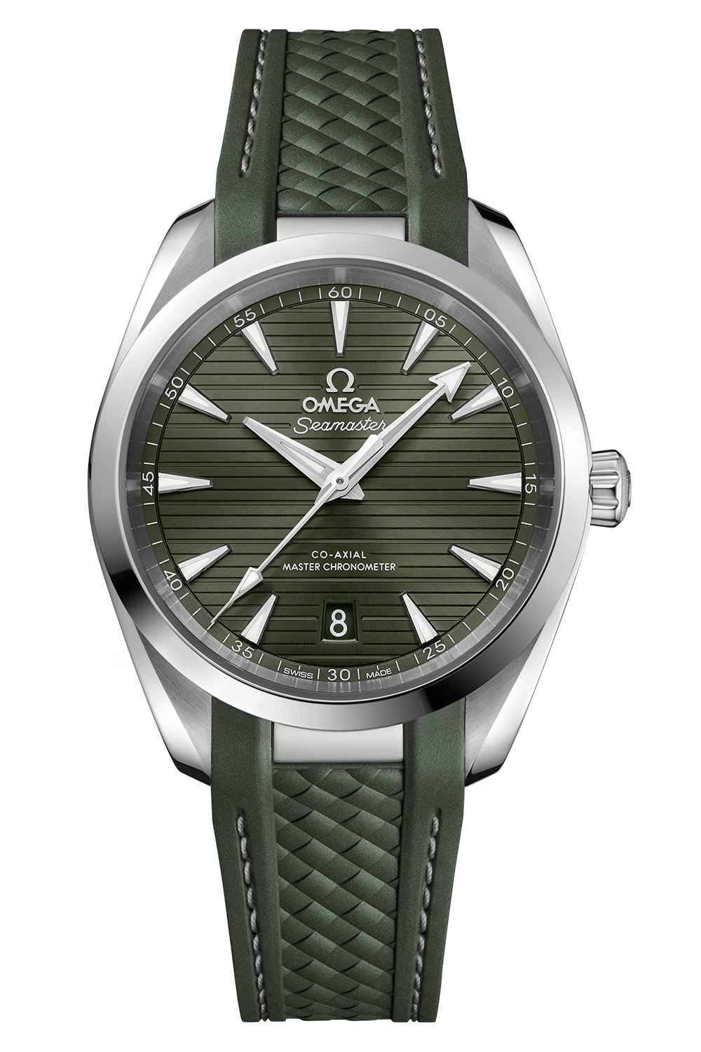 The watch is presented on an integrated green structured rubber strap with grey stitching and polished-brushed fold-over clasp, and powered by the OMEGA Master Chronometer calibre 8800, certified at the industry’s highest standard by the Swiss Federal Institute of Metrology (METAS).