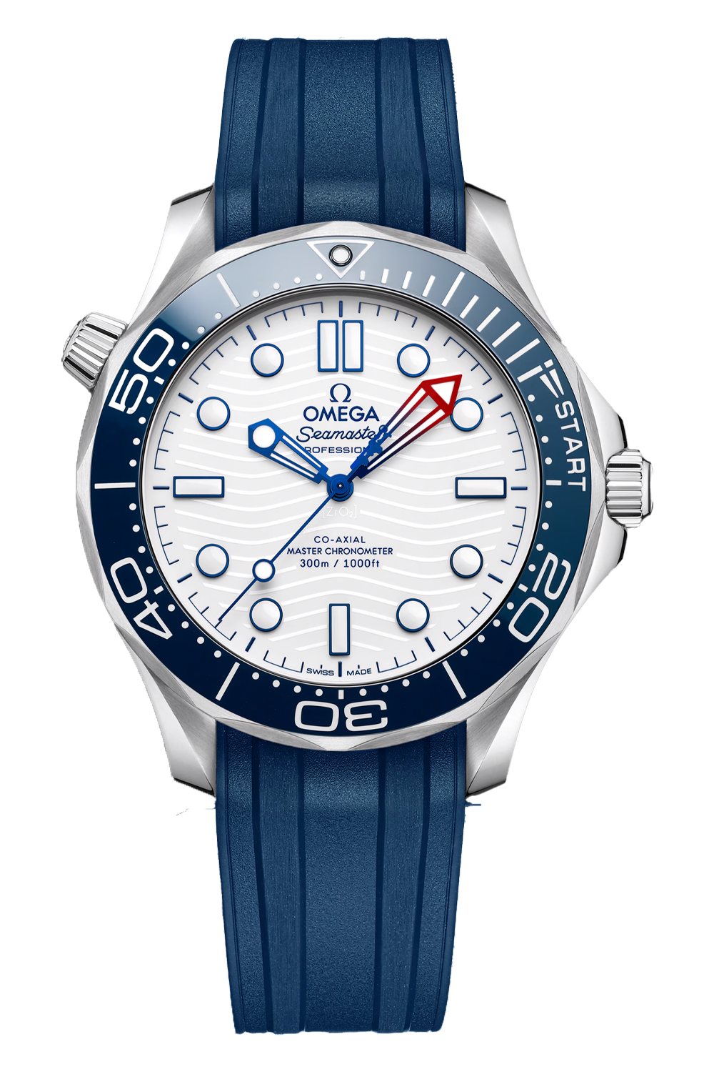 impressive Seamaster Diver 300M with regatta scale and commemorative caseback.The 42 mm Seamaster Diver 300M in stainless steel has a blue ceramic unidirectional bezel with a regatta scale, comprised of two 5-minute pre-start sections, and START section with regatta-inspired flag.